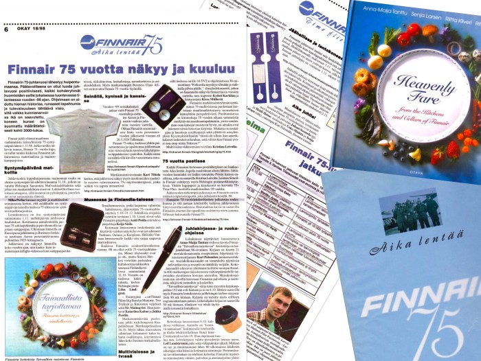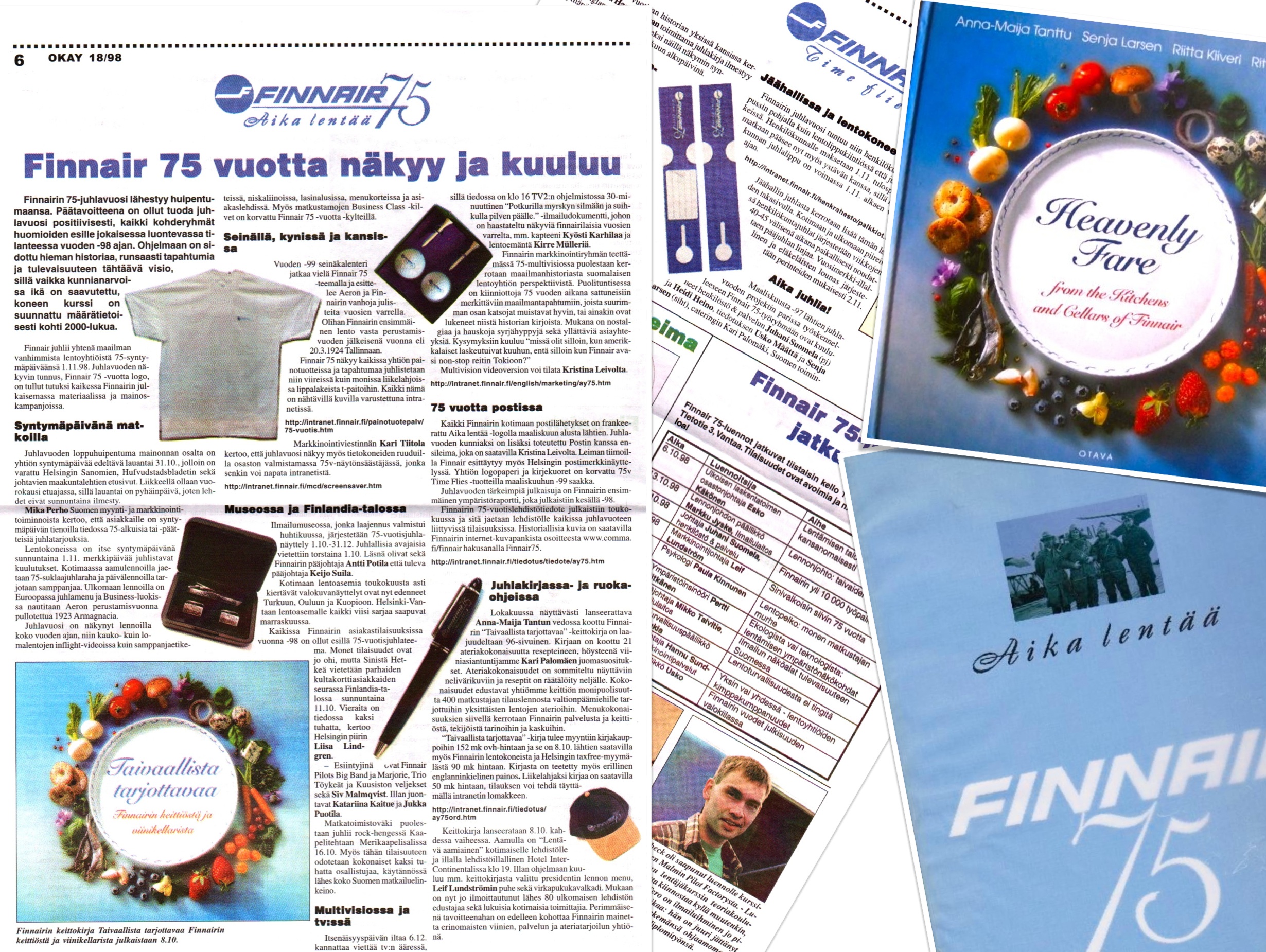 Kun Finnair täytti 75 vuotta yhtenä maailman vanhimmista lentoyhtiöistä, sen tuli näkyä kaikessa ja kaikkialla. Tapahtumia sekä tuotteita oli valtava määrä niin kotimaassa kuin maailmalla. Olin hankkeen sihteeri ja mukana kirjoittamassa Taivaallista tarjottavaa -keittokirjaa, jonka sivuille kokosimme paitsi reseptejä, myös tarinoita ja kuvia yhtiön matkan varrelta. Mitä Presidentti Kekkonen sanoi, kun löysi baarista hiusneulan?