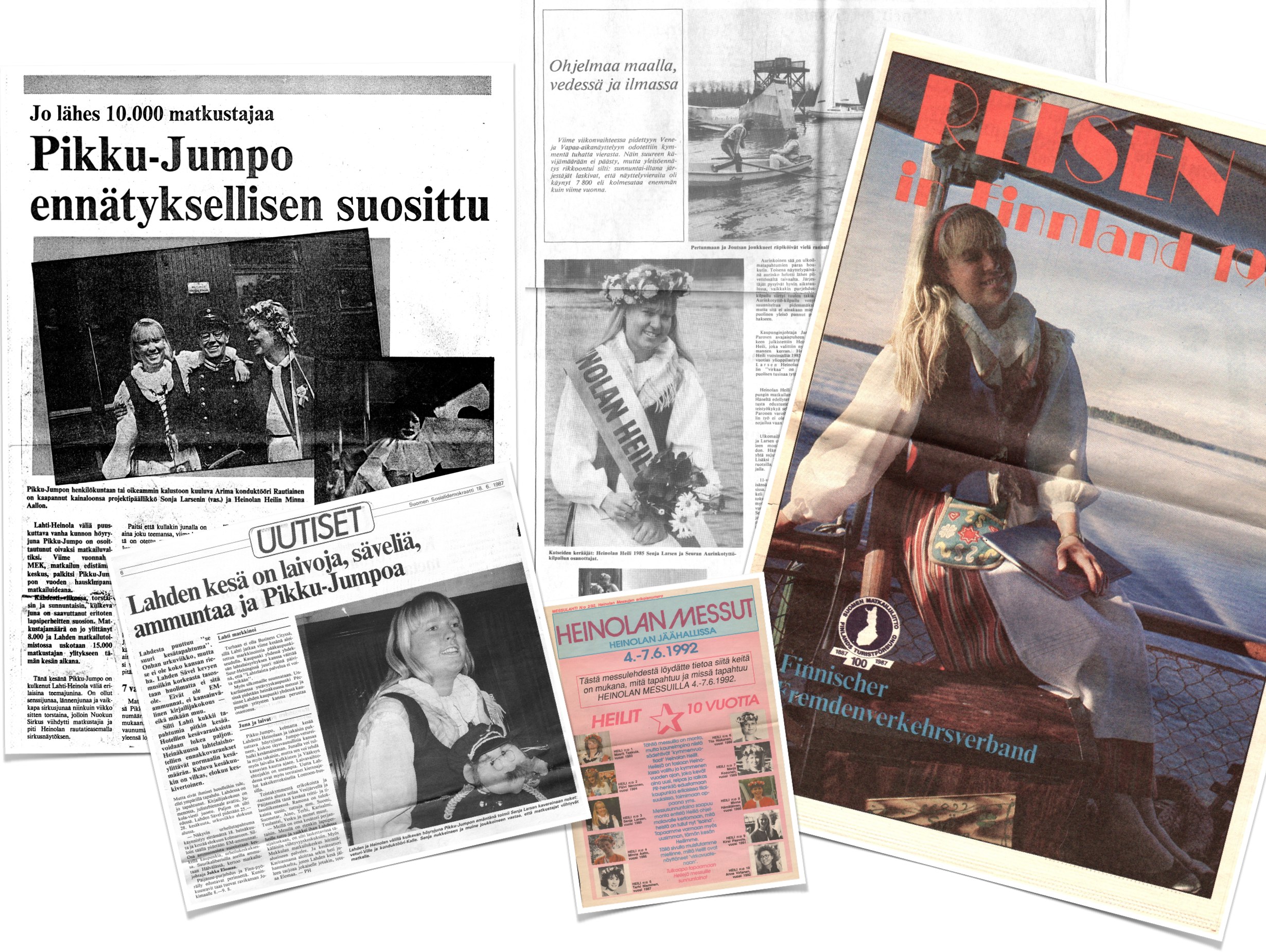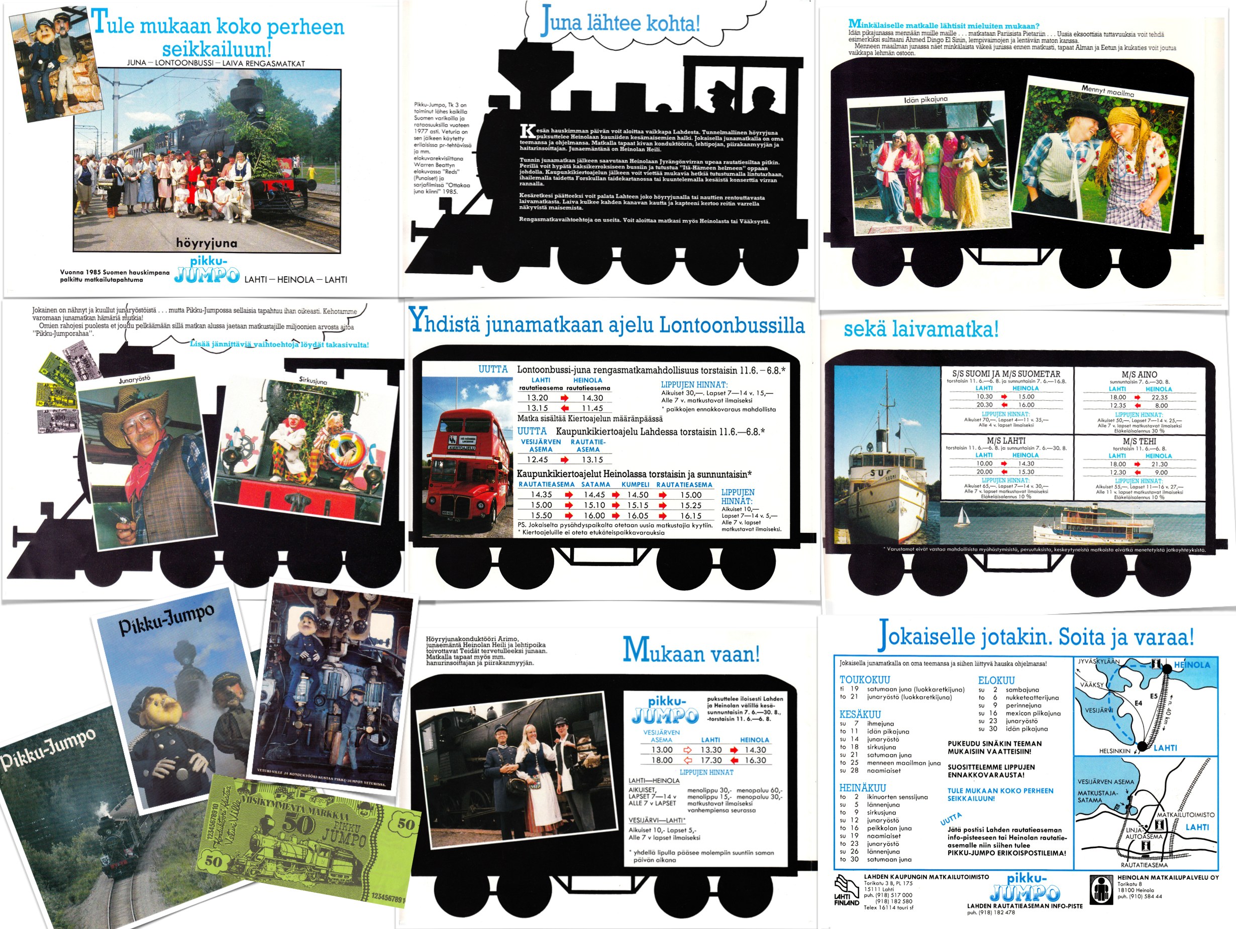 Painoimme väärää rahaa ryöstimme junan. Olin saanut mahtavimman kesätyön Heinolan Heilinä, kesäkaupungin PR-emäntä, jokA emännöi kansallispuvussa Lahden ja Heinolan välillä liikennöineessä höyryjuna Pikku-Jumpossa. Jatkoin parin vuoden ajan Pikku-Jumpo hankkeen projektipäällikkönä: suunnittelin ohjelmat, esitteet, julisteet. Ohjelmat tehtiin harrastelijateatteri- ja partiolaisryhmien kanssa. Matkustajat täyttivät junat. Saimme MEK:ltä Suomen hauskin matkailutuote -palkinnon!